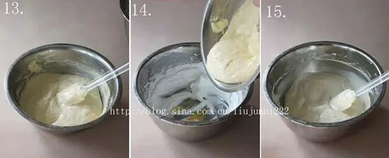 14.再将步骤12的蛋糕糊倒回剩下的蛋白霜中