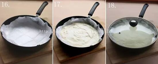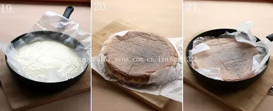 20.然后将案板盖在锅子上,将案板连同锅子一起翻转,这时蛋糕连同油纸一起会翻落在案板上
