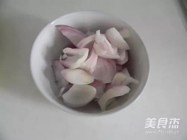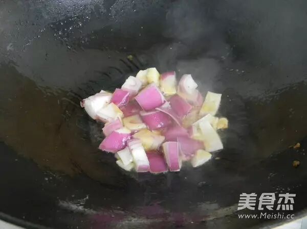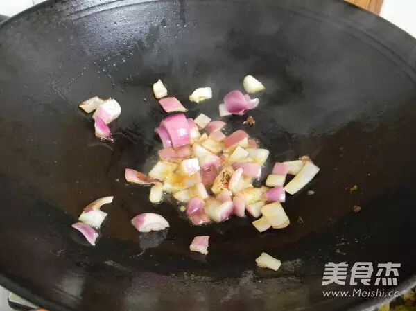 4.炒锅热油炸香花椒粉后,放入洋葱