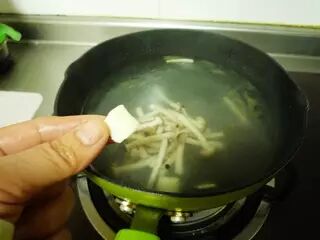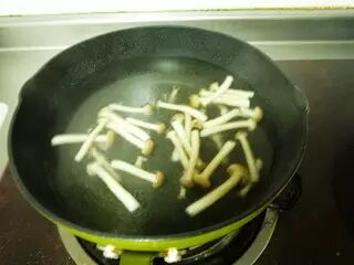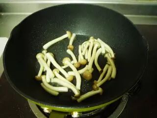 起油锅,放蟹味菇炒至变软出汁。