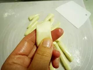 取一条借助食指和拇指捏宽捏薄拉长。