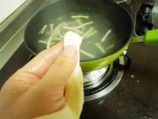 待锅里水烧开后,左手拿着面片条。