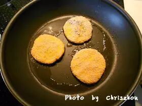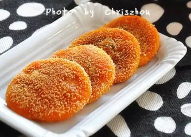 锅中倒入适量的植物油,放入南瓜饼,用小火煎至两面金黄色即可。