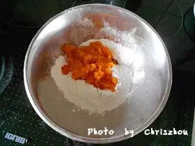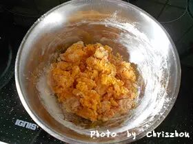 用筷子把南瓜和粉搅拌成雪花状,如太干可以稍微加入一点牛奶或者清水。