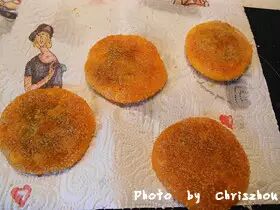 出锅后的南瓜饼放在厨房餐巾纸上吸走多余的油即可装盘食用。