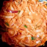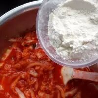 为了更准确地写明泡菜饼的水份含量,我把泡菜用手尽量的攥干了水份称重。如果你没有太多的泡菜汤,就用水代替,并且考虑盐的量。我这里没有加盐,因为泡菜加上泡菜汤咸味正好。