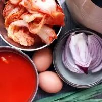 2. 泡菜切丝,洋葱蒜苗切小段