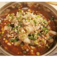 5. 倒入煮好的汤底,再将切好葱,姜,蒜粒洒在鱼肉的表面。