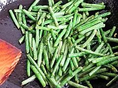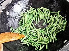 炒锅倒油烧热,倒入豆角翻炒。