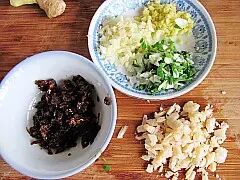 葱姜蒜全部切末,虾米用水泡软也切末,芽菜取出备用。