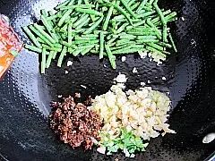 把豆角拨在锅边,底油放入葱姜蒜,虾米和芽菜煸炒出香。