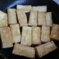 2. 平底锅内放色拉油,烧热后放入豆腐,煎至两面金黄色