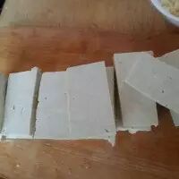 1. 北豆腐切块:长*宽*高=6*3*1厘米,用盐水浸泡半小时