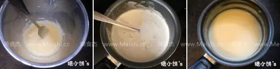 1.蛋黄加入白砂糖搅打至发白,加入牛奶中搅匀,煮沸几秒