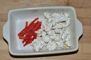 鲜核桃去皮去褐色膜,红椒切丝。