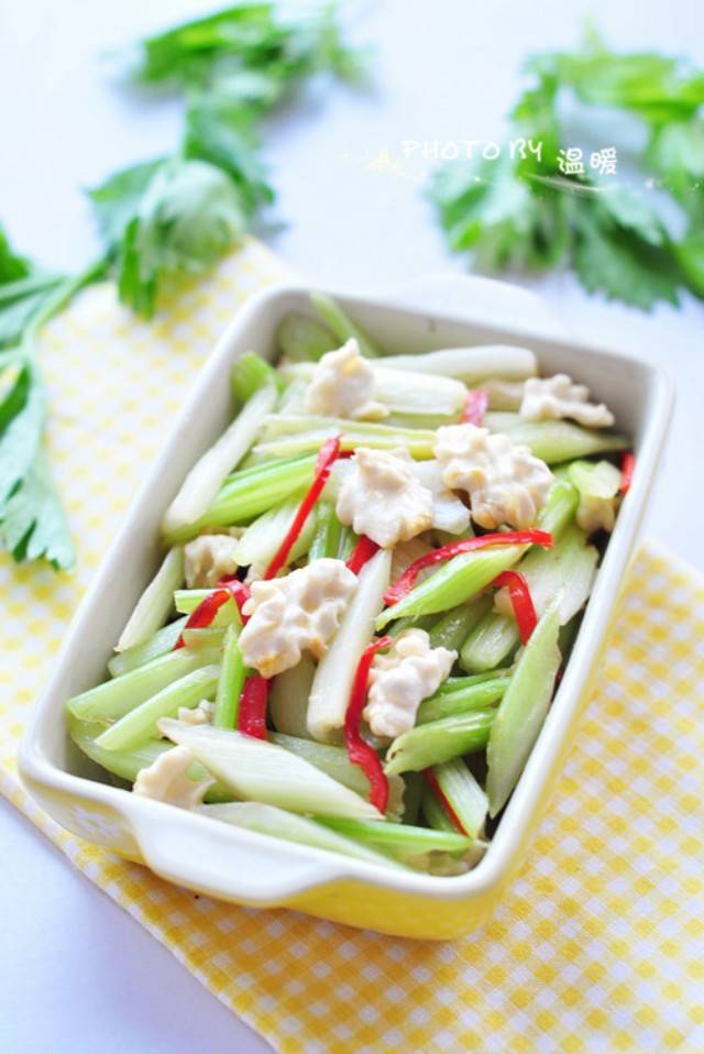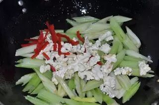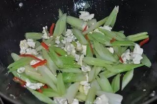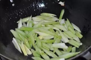 将芹菜放入锅中翻炒至熟。