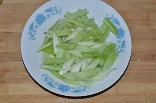 芹菜洗净,削去外皮,斜切成段。