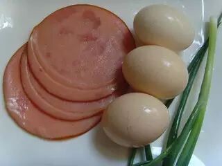 准备材料:火腿片3块,鸡蛋3个,葱1条。