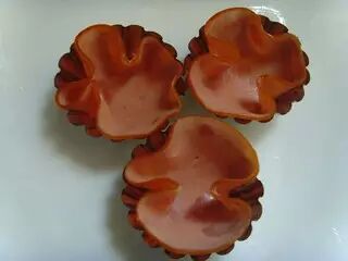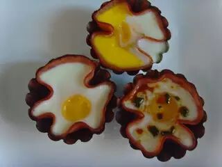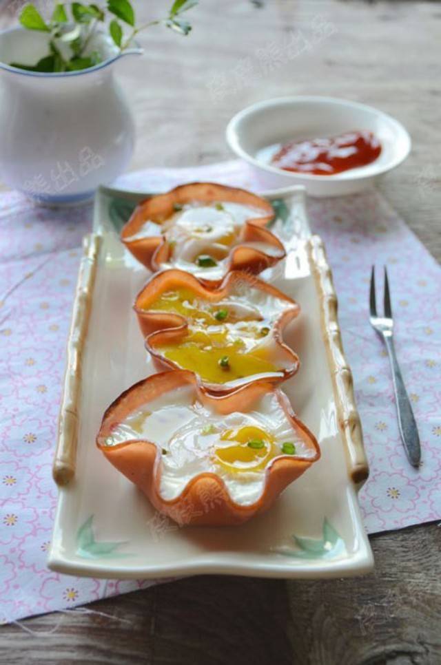 鸡蛋磕入火腿片里(尽量选小个鸡蛋,大的装不下)。
