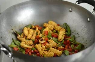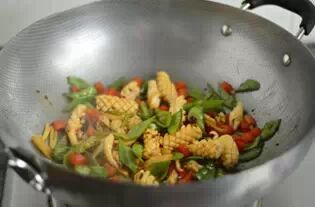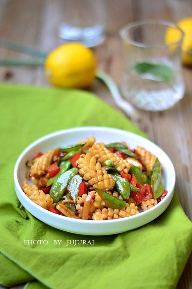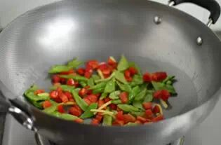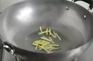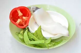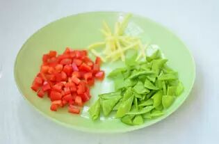 姜切丝、红甜椒切丁、荷兰豆撕去老筋切段