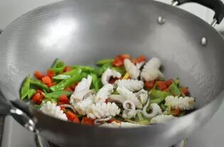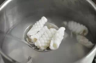 锅里烧开水,水滚后放入鱿鱼,焯至卷曲后立刻捞出