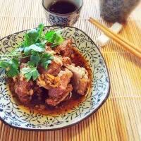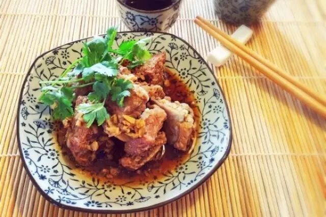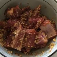 1. 排骨洗净斩小装入大碗内,放入蒜蓉姜蓉以及盐、料酒、生抽拌匀,腌制15分钟。之后加入老抽和蚝油拌匀。