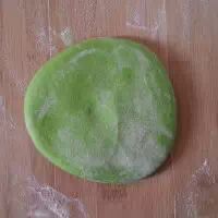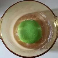 5. 面粉加荠菜汁揉成面团后盖上保鲜膜醒30分钟。