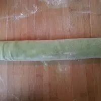 8. 在面皮上撒上一层干面粉防粘,把面皮裹在擀面杖上面。两手握住擀面杖的两端,重复像前推和像后拉的动作。每推拉2次就把面皮从擀面杖上摊开,在撒上干面粉,换一个方向,重新裹在擀面杖上重复推拉的动作。
