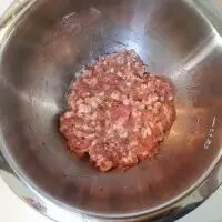 2. 五花肉剁碎后加盐1勺、淀粉1勺、香油1勺、耗油1勺、花雕酒1勺、生抽2勺、姜末少许腌制均匀。
