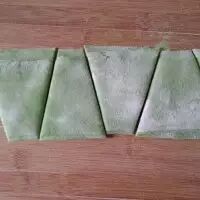 10. 在面皮上再次撒干面粉放置粘连,然后将面皮切成条状重叠在一起即可。