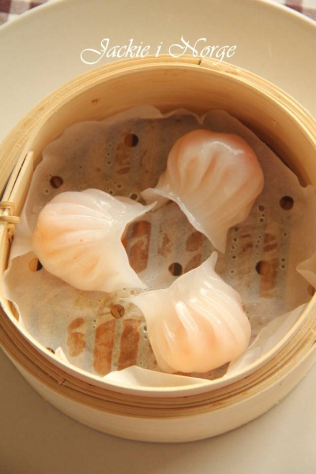 六寸蒸屉垫油纸或胡萝卜(我为了好看,两个都用了),再摆好虾饺