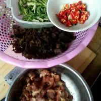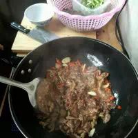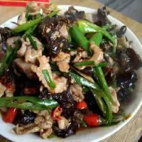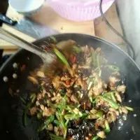 3. 第三步:前一步骤差不多后,倒进青椒和木耳继续翻炒出香味,