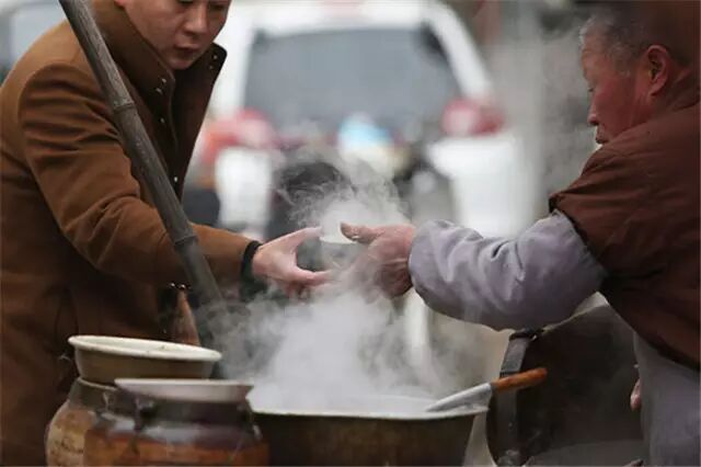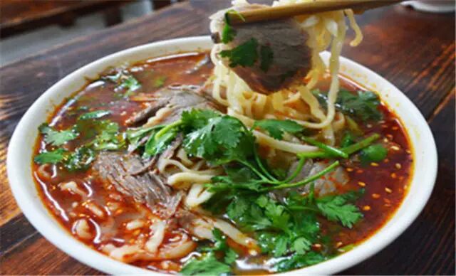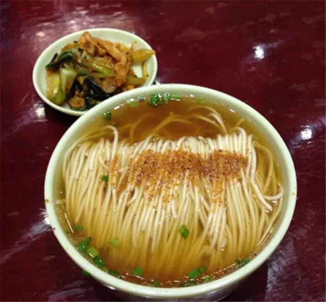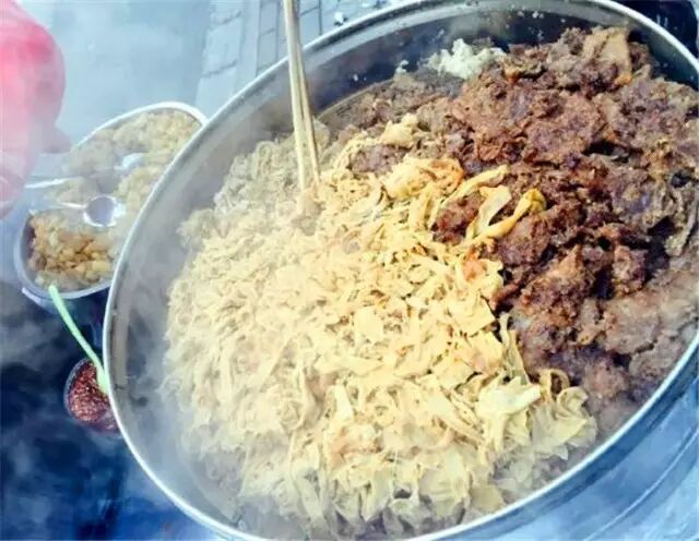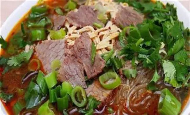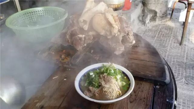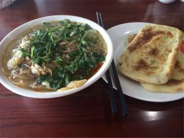 来头很大的牛肉汤,汤里有千张、豆饼、粉丝,牛肉、辣椒、上面飘着一层的是牛油,撒上香菜,就个烧饼,南方北方通吃喽。