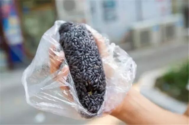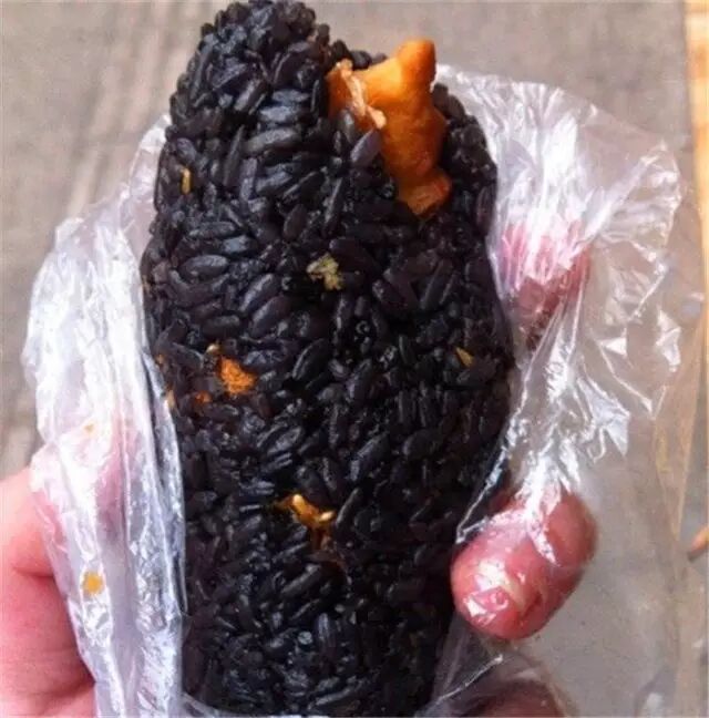 是另一种颜色的粢饭团,南京乌饭是用乌饭叶子染成的,染好以后做熟,配上咸蛋黄、油条、肉松、白糖,毛巾两头一拧,就成了。