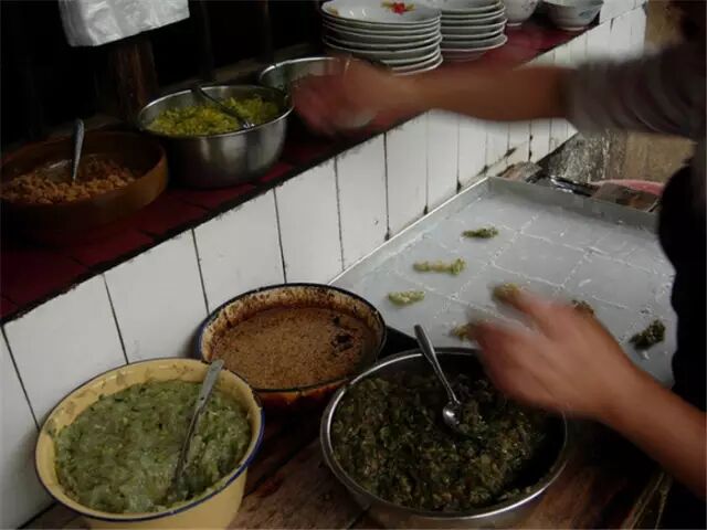 包米果好不好吃,首先要看磨出来的米浆细不细嫩,没有耐心做好前面的泡米磨浆步骤,馅料做的再好吃,都挽回不了败势。馅料里除了拌好的肉馅,春夏秋冬按季不同,加添时令蔬菜。