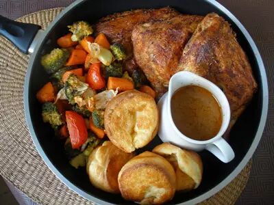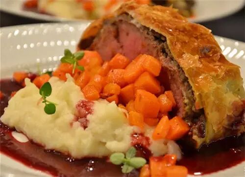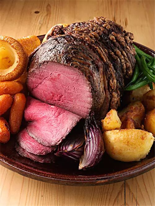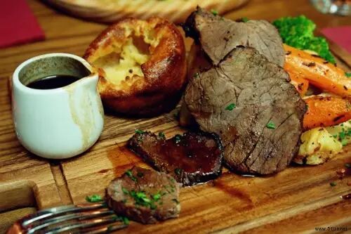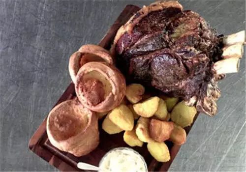 英国人对烤肉的热爱无与伦比,每个星期日基本固定为烤肉大餐日,羊羔肉、牛肉、猪肉、鸡肉都是原材料,吃起来的豪迈劲一点儿不输于我国武侠小说里的人物,不过最受英国人欢迎的还是搭配着约克郡布丁吃的烤牛肉。约克郡是英国东北面的一个历史悠久的郡,中世纪的光影在那里仿佛还随处可见。但对于吃货来说,这些历史抵不过一个布丁。