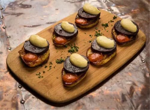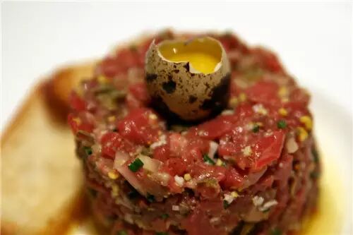 汉堡包里的牛肉饼据说就是由鞑靼牛肉刺激出来的,一个小知识,当你看到带着“鞑靼”美食的东西,十有八九是牛肉的,并且是生的。把上好的小牛肉贴刀切丁,尽量不要剁,切到尽量小,然后放上黑胡椒、茴香籽、辣椒面、色拉油、迷迭香、盐、芥末辣酱油等拌匀,团成肉饼,撒上新鲜香料叶,能吃鸡蛋的打上一个生鸡蛋,别想着熟不熟的问题,整上那么第一口......个中滋味,看缘分吧。