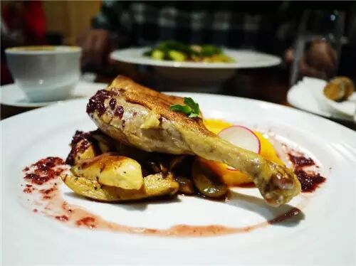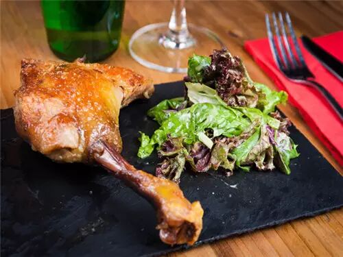 顾名思义,就是油封住的鸭子,做法简单,但至少需要一个星期的时间才能制作完成:先是用盐和胡椒、迷迭香、肉蔻腌制鸭腿,然后就是用大量的鸭油将其盖满,烤几个小时以后,冷藏放置一星期。吃的时候拿出来用黄油煎香,因为浸泡到位,连骨头都是酥香软松的,更别提煎到恰到好处的鸭皮了。