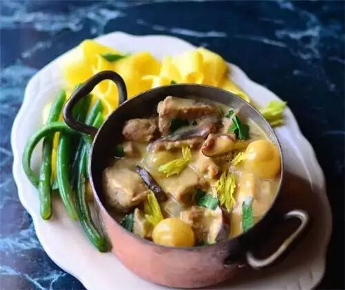 一锅白汁烩小牛肉,是法国人招待客人来家的重点菜,小牛肉切成小块,过黄油炒香,加上由奶油、洋葱、面粉、芹菜、鸡蛋、九层塔制成的白酱煨煮软烂,放上白蘑菇,收汁到浓稠,期间还有一些特制秘方的添加,让客人吃一口,叹一句:毕竟是在法国!