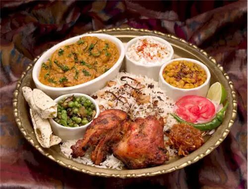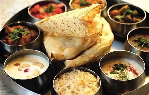 印度简餐,一份塔利里包括了米饭、烤饼、咖喱汤、沙拉、肉(羊肉、鸡肉、鱼肉,印度宗教派系林立,禁忌较多,猪肉几乎是不吃的,牛是神圣的动物,羊肉太贵,鱼肉不爱,所以大部分肉类菜靠鸡肉来撑)