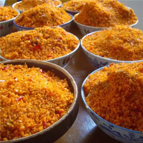 腊肉不仅限于猪肉,还可以腊肠、腊猪头、腊鸡、鸭、鱼,以前还有腊野味,做腊味之前要先做好配腊肉的白辣椒酸辣子。