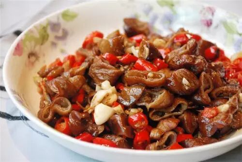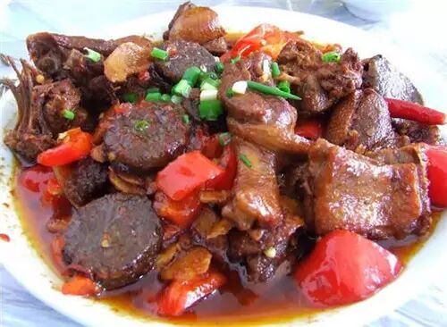 鸭子血直接放进装有糯米的碗里,待板结以后,上锅蒸熟,切片,和鸭肉炒在一起,再焖煮一会儿就成了,少不了湖南人的辣椒。吃完一顿饭,大汗淋漓,温补又热乎。街上有现成的血粑卖。