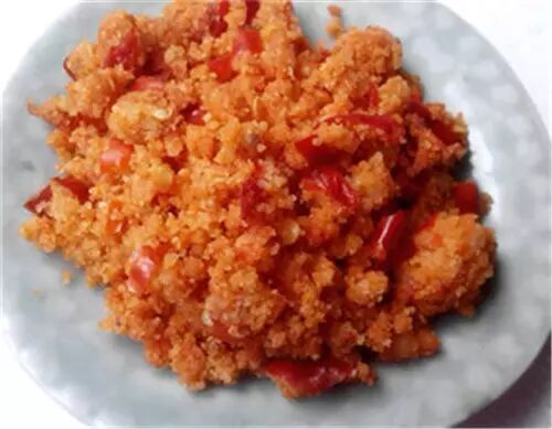 包谷酸一般流行在湘西一带,在秋收的玉米晒干入仓前,选出最饱满的的一些,磨成粗粉,拌上舂碎的辣椒,加上少许盐,拌开,放到土坛子里密封,有太阳的日子,搬到墙角晒晒很快就会发酸,至少再封十多天,忍不住的,就可以掏出来一碗炒鸡蛋吃了。不止鸡蛋,包谷酸可以炒配一切小菜肉类,也可以光光的蒸食,但总要过一遍油,让香油或是猪油将玉米粉润过了,那种酸酸辣辣的口感,才不寡,而是油润润的,香融融的,渗透在米粒之间。