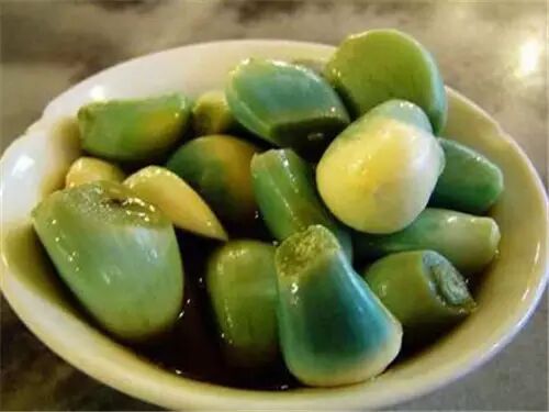腊八蒜主要吃的是泡蒜的醋,蘸饺子吃。泡成绿色的蒜要么就是一口饺子一瓣蒜的吃,要么就是拿来烧肥肠、肚肺。
