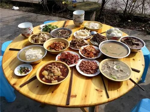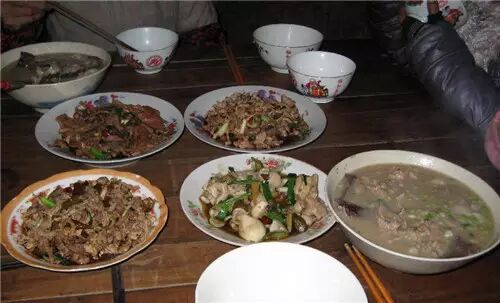 各地杀猪饭菜式不同,但“刨猪汤”是要有的,蒜苗干辣椒爆炒的腰花、猪肝,血旺和豆腐丸子汤、萝卜排骨汤也是有的。一个全席下来,不光有猪肉,有的人家还杀鸡宰鸭,十分隆重的铺张一回。对于一些家庭来说,这顿饭的意义甚至大过年夜饭,因为出门在外的人,一年不见的远亲,都能够在这个时候聚到一起,大大的热闹一番。
