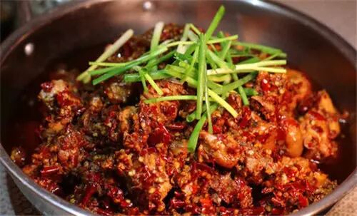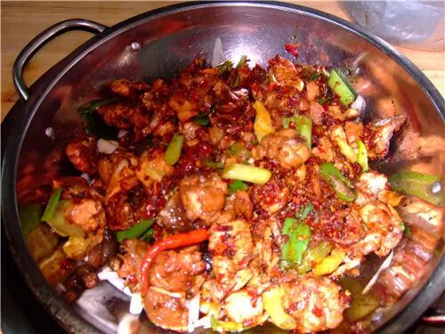 炒好的辣子鸡起锅装盆,上面一定还要撒上现割的蒜苗、小香葱,热气一冲,满屋子的香。