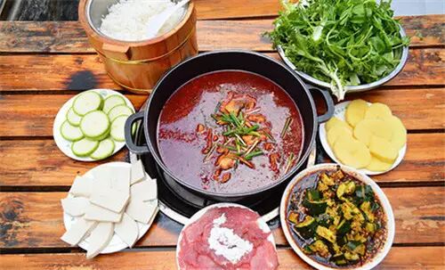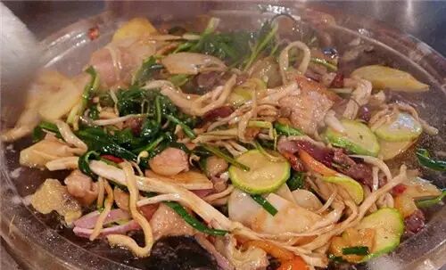 豆豉火锅,豆豉自然是主角,不过还有一个和它地位相当的搭档,那就是炒香炒干的五花肉油渣。五花肉切大片,下到铁锅里制成油渣,加上花椒、葱蒜、姜,山胡椒混合,汆汤做成锅底,就可以涮火锅了。