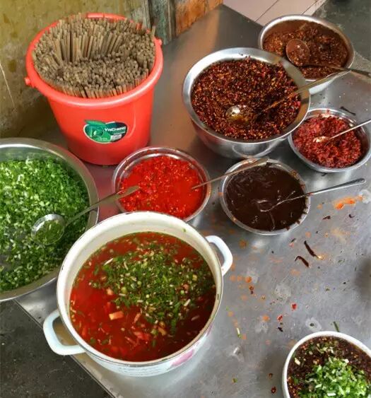 这样炖出来的羊肉,不烂不化,把肉挑出来切薄片,盖在用羊肉原汤打底的米粉上,剩下的作料就由着你爱放什么放什么了。薄荷叶子有的是,生蒜苗有的是,生韭菜、辣椒、折耳根、蒜油、辣椒油、糊辣椒面,一个都不会少提供,只要吃得完,你加满一碗都没关系。