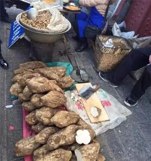 大理街头常常见到卖的,就像一坨坨大树根,鲜切鲜卖,吃起来不像水果,也不像药,清甜清甜的,有的还蘸着碱粉吃,不知道是一种什么习惯,是否和有些地方嚼槟榔的习惯相仿?就这么一片一片的卖,不知道一天能卖出去几条,这生意也是有趣。听说大理民间还有葛根会这么一个节日。