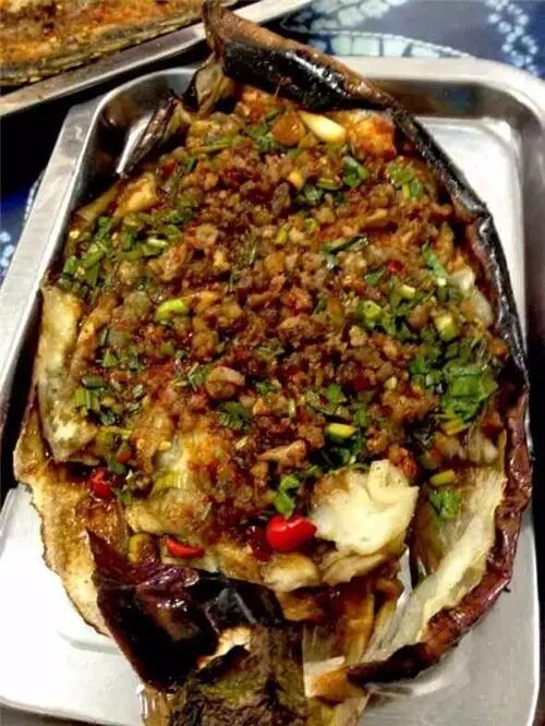 同样造型,下面可能是一条烤鱼而不是茄子,上面都会撒上小米辣和香草碎、蒜末、肉末,再刷酱,烤熟了,盐味恰好的,都好吃。